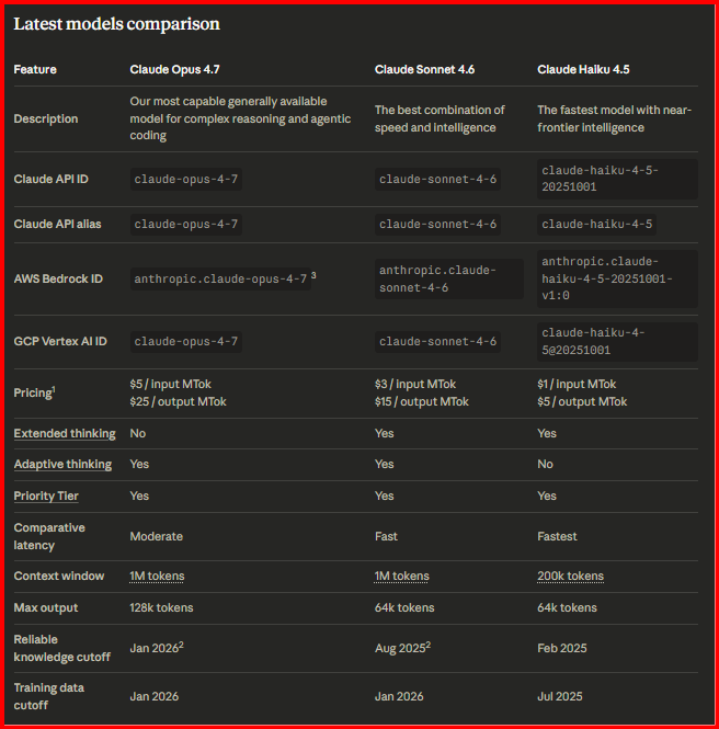 | Spesifikasi | Claude Opus 4.7 | Claude Sonnet 4.6 | Claude Haiku 4.5 |