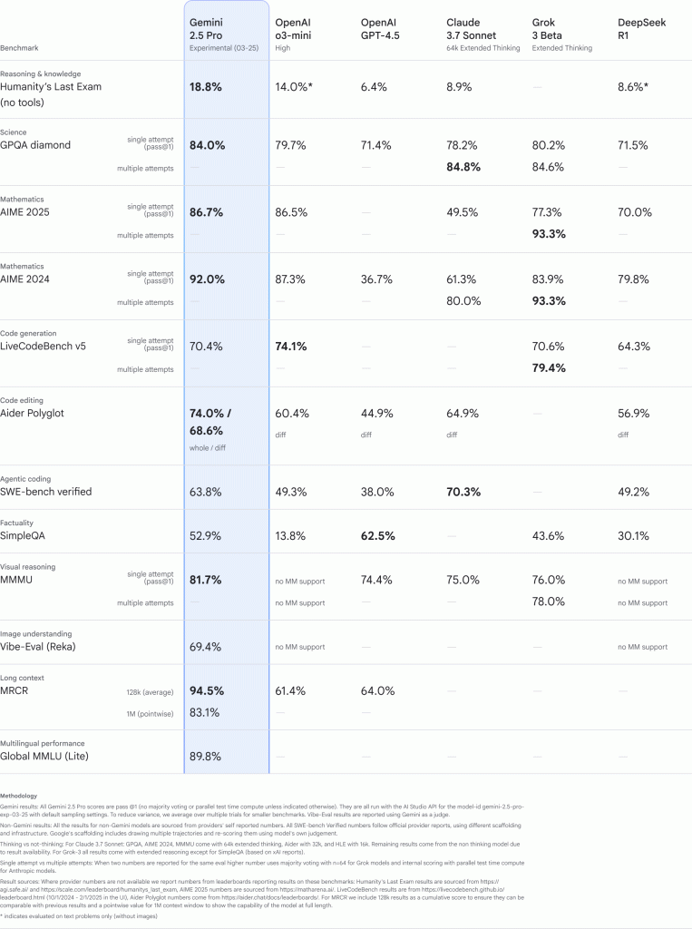 Gemini 2.5 Pro Experimental merupakan model tercanggih kami untuk tugas-tugas kompleks. Model ini menduduki peringkat teratas di papan peringkat LMArena yang mengukur preferensi manusia  dengan selisih yang signifikan, menunjukkan model yang sangat mumpuni dan dilengkapi dengan gaya berkualitas tinggi. 2.5 Pro juga menunjukkan kemampuan penalaran dan pengkodean yang kuat, unggul dalam tolok ukur pengkodean, matematika, dan sains umum.