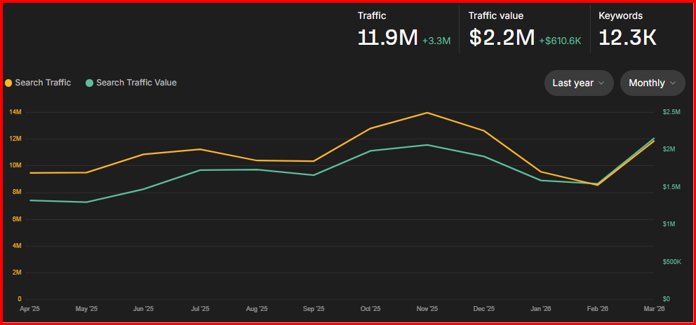 Pada Maret 2026, perplexity.ai mengalami peningkatan trafik pencarian, mencapai 11,9 juta kunjungan, yang merupakan peningkatan sebesar 3,3 juta kunjungan dibandingkan bulan sebelumnya. Nilai trafik meningkat menjadi $2,2 juta, atau pertumbuhan sebesar $610,6 ribu.