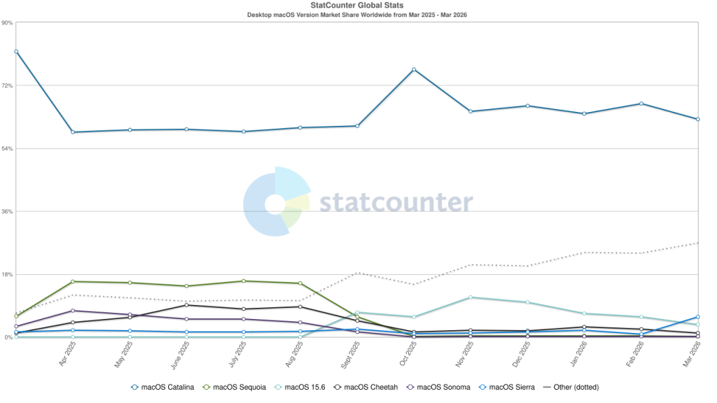 Grafik StatCounter menunjukkan pangsa pasar versi macOS desktop global periode Maret 2025–Maret 2026. macOS Catalina mendominasi sepanjang periode, meski sempat turun lalu kembali naik. macOS Sequoia awalnya cukup tinggi namun menurun tajam setelah September 2025.