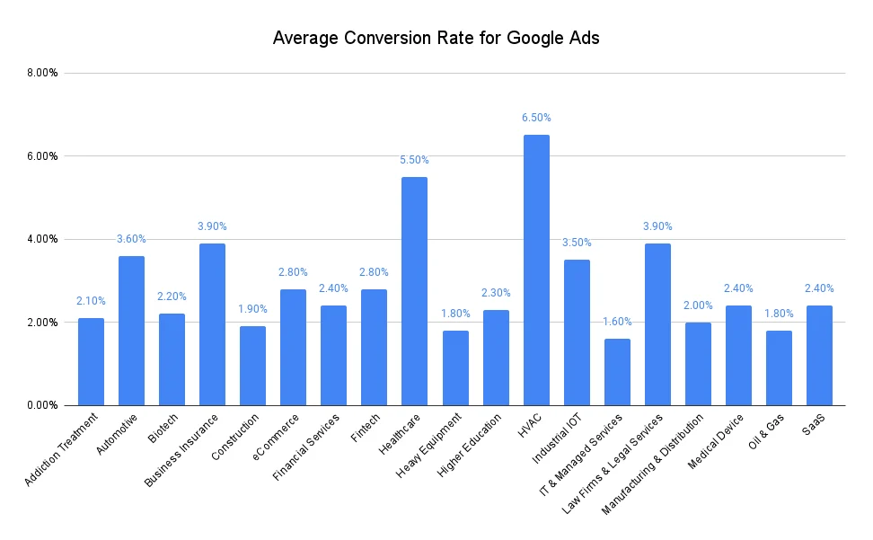 Laporan First Page Sage yang menganalisis 121 akun klien antara 2021 dan 2025 menunjukkan rata-rata conversion rate Google Ads secara keseluruhan adalah 4,8%. Angka ini bervariasi signifikan per industri, dari 1,6% untuk IT & Managed Services hingga 6,5% untuk HVAC.